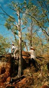 Gisteren heeft Lyn gezegd dat we vandaag niet met de groep mee hoeven rijden, maar dat wij vandaag met z’n tweeen mogen gaan. Omdat Bianca’s paard Molly wondjes had op haar schoft mocht Bianca Cool Joe nemen, het paard van Peter. Ik neem natuurlijk "mijn" paard Biddy mee. De tocht is ontzettend leuk. We rijden ongeveer twee uur door de outback. Af en toe een galopje (Cool Joe is een cattlehorse en doet spontaaan vliegende galopwissels!) maar meestal gewoon in stap om beter van het landschap te kunnen genieten. Na deze laatste rit te paard nemen we de motor om gewapend met foto-en video camera nog zoveel mogelijk vast te leggen voor thuis.